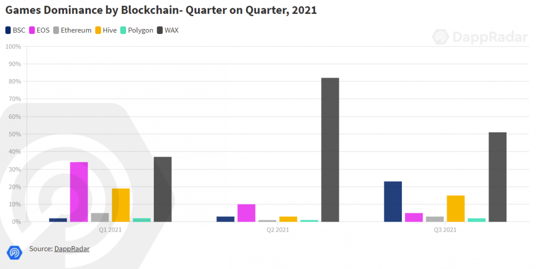 Jogos do tipo "jogue para ganhar" (P2E, na sigla em inglês), ou jogos baseados em blockchain em geral, estão ganhando força rapidamente trac podem se tornar um mercado enorme dentro do setor de NFTs e criptomoedas. Para contextualizar, o número de carteiras ativas únicas que interagiram com jogos em blockchain subiu para 754.000, o que representa quase 50% das atividades na indústria de blockchain, segundo a DappRader. A blockchain World Asset Exchange (WAX) é a que apresenta maior uso relacionado a jogos, com uma média de mais de 350.000 carteiras ativas diariamente no terceiro trimestre.
