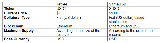 Em nossa comparação entre SameUSD e Tether (USDT), analisaremos o seguinte: