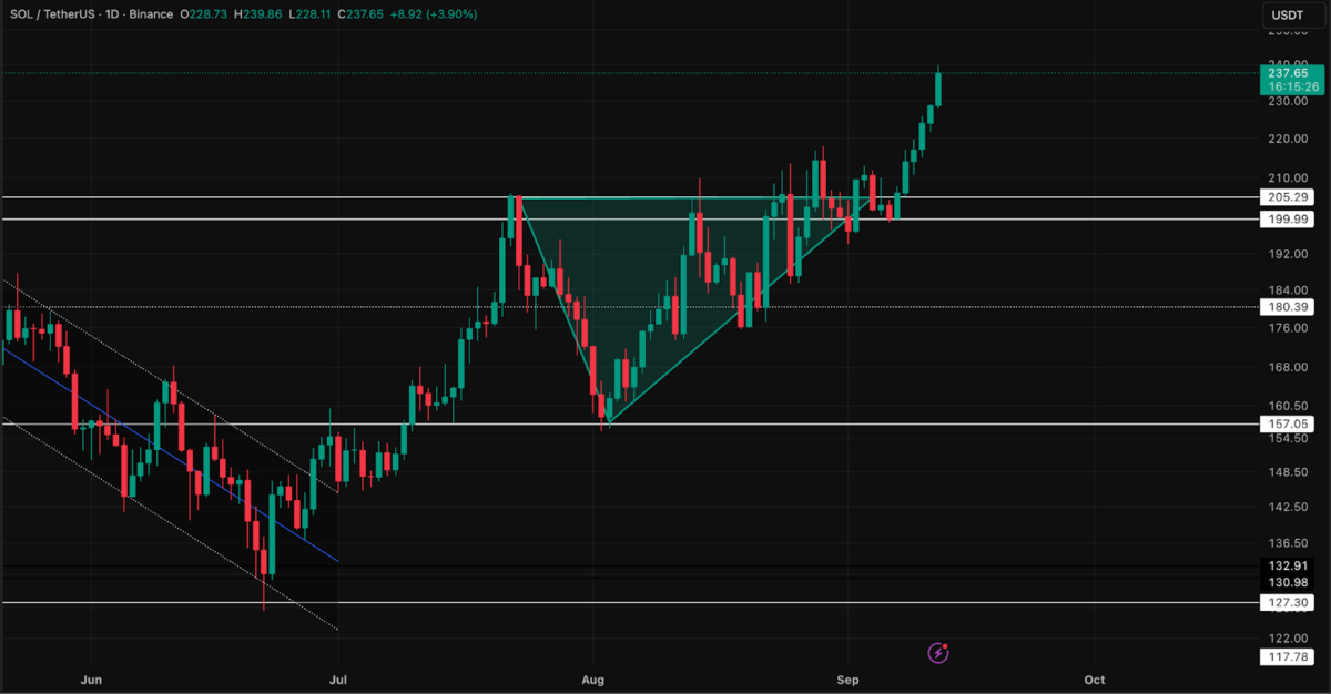 Para os analistas gráficos, a expectativa em torno do preço da Solanajá vinha crescendo desde a recuperação da altcoin no início de agosto. Para contextualizar, a SOL subiu mais de 50% somente nos últimos 40 dias.