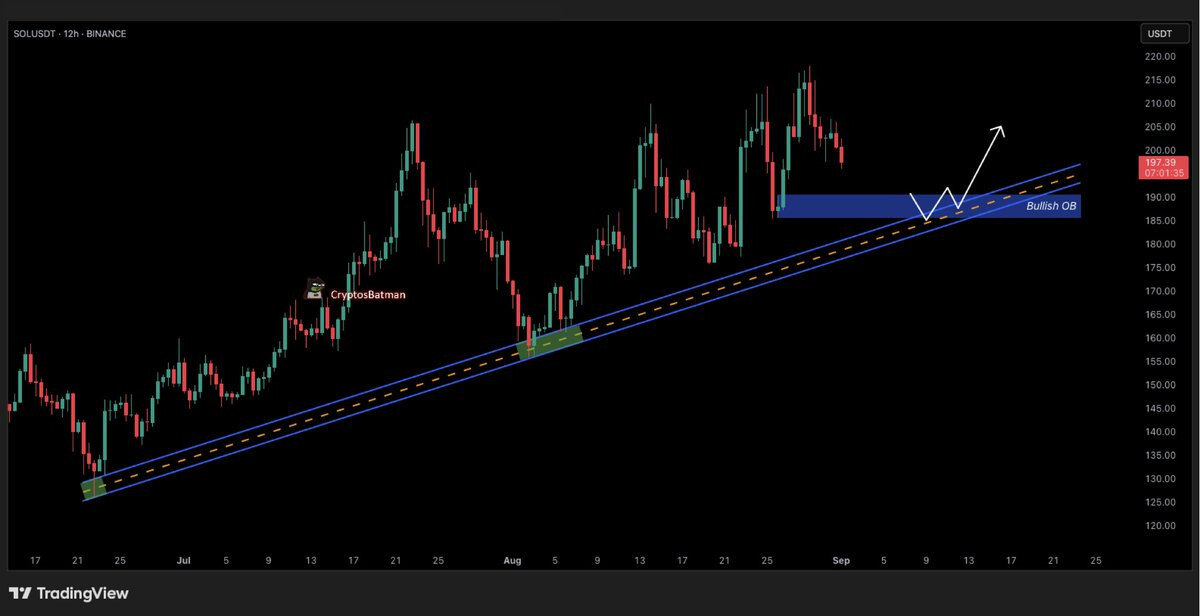 A zona de US$ 186 a US$ 200 é considerada uma área de suporte crítica onde os compradores podem entrar em ação. Os gráficos da CryptosBatman indicam que a SOL pode testar a faixa de US$ 185 a US$ 190, uma zona que se alinha com uma linha de tendência ascendente observada desde julho. Se os compradores mantiverem esse nível, a SOL poderá formar uma mínima mais alta e retornar em direção às máximas anteriores. Além disso, a SOL alcançou um marco no espaço de Ativos do Mundo Real (RWA), com ativos tokenizados na blockchain ultrapassando meio bilhão. Essa combinação de suporte técnico e crescente adoção de RWAs reforça o motivo pelo qual as notícias Solana hoje continuam sendo otimistas para traders e investidores.