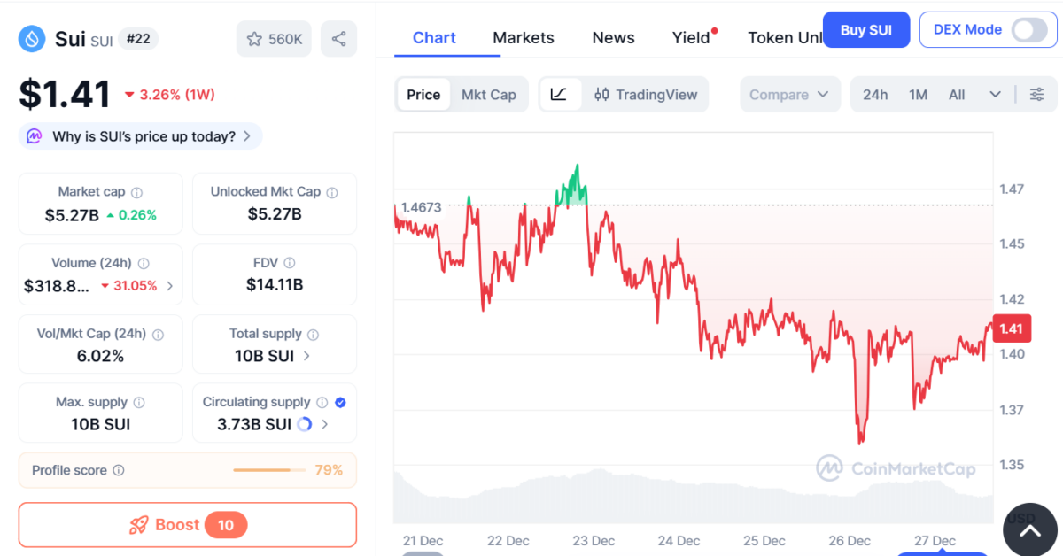 Essa notícia fez com que o SUI atingisse a máxima semanal de US$ 1,48. No entanto, o entusiasmo em relação à notícia rapidamente se dissipou e o SUI começou a recuar. Em 27 de dezembro, o SUI havia se estabilizado em torno de US$ 1,41. Essa tendência de baixa levou os investidores a buscarem altcoins para se protegerem contra novas perdas.