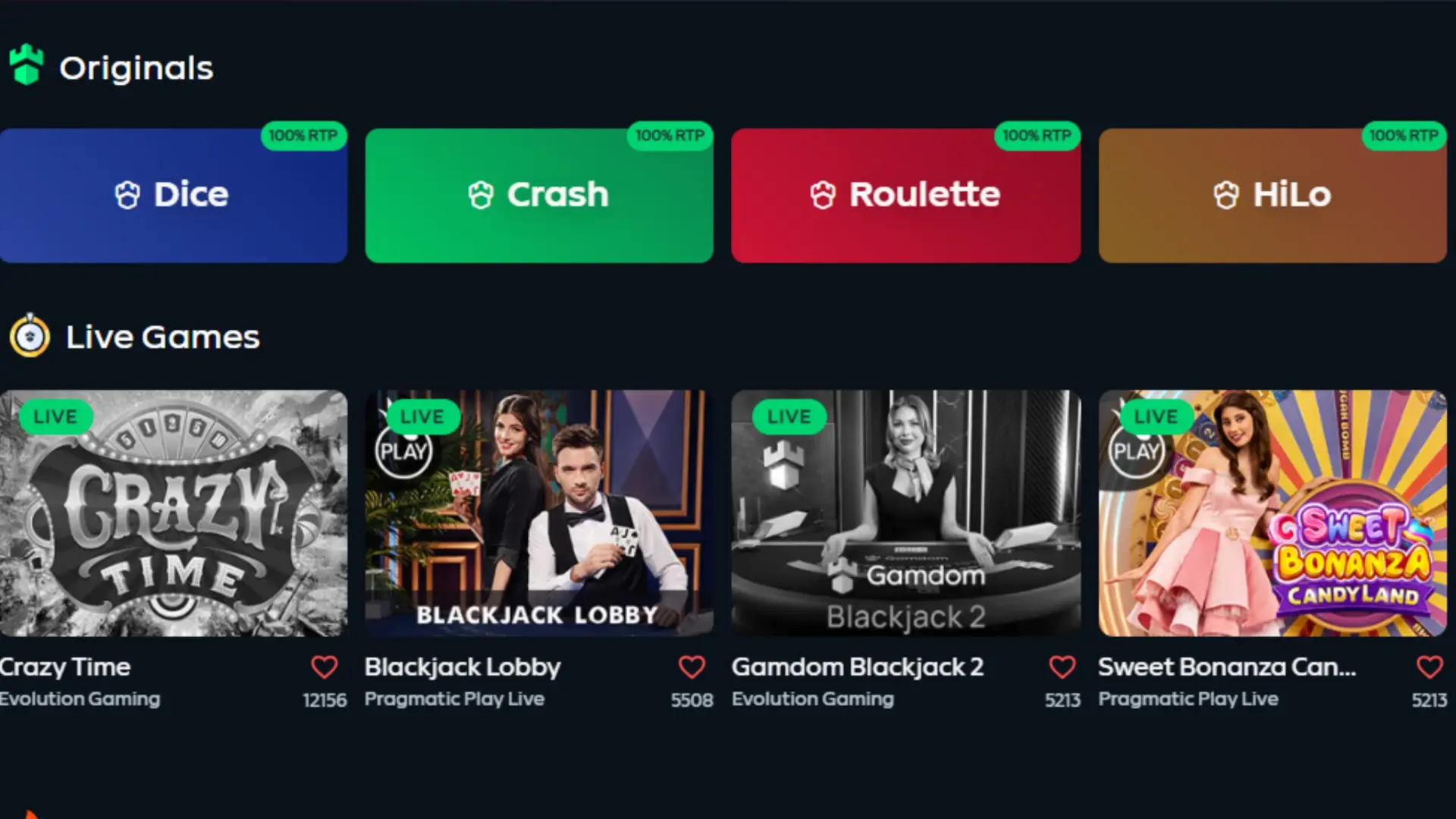 Gamdom принимает Bitcoin для пополнения и вывода средств. Также поддерживаются 24 другие криптовалюты, включая ETH, LTC, USDT, USD, USDC и фиатные валюты. Доступно более 6000 игр . В ассортименте представлены ставки на спорт и оригинальные игры со 100% возвратом игроку.