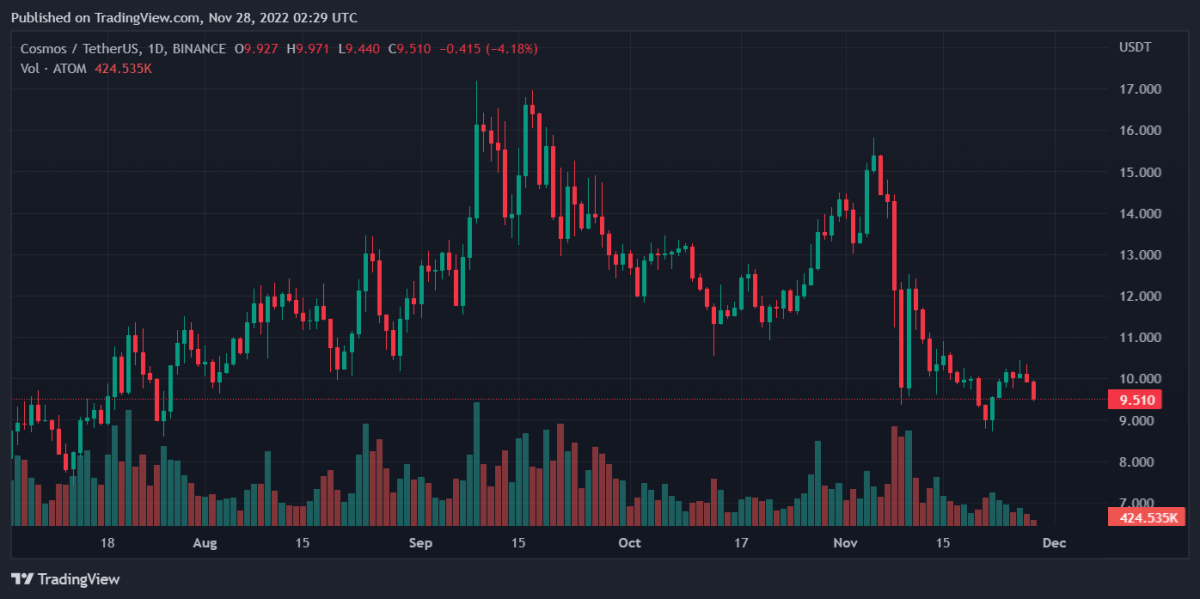 Динамика акций Cosmos ничем не отличается от остальной части рынка. Последние данные показывают, что за последний день они потеряли 6,23%. За неделю же они выросли на 6,06%. Текущая цена акций ATOM находится в диапазоне 9,53 доллара.