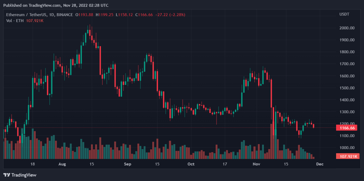 цена ETH составляет около 1166,07 долларов США. Рыночная капитализация этой монеты оценивается в 142 696 635 137 долларов США. Суточный объем торгов этой монетой составляет примерно 5 305 832 767 долларов США.