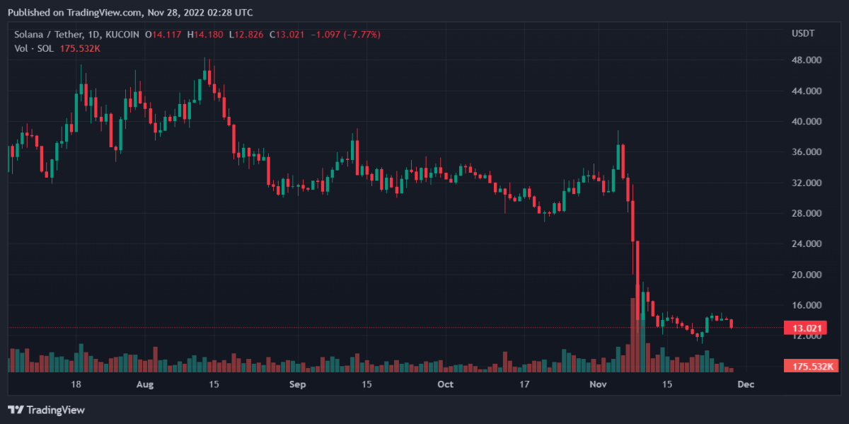 В связи с негативным трендом наблюдается снижение стоимости Solana . Последние данные показывают, что за последние 24 часа она потеряла 8,08%. За неделю этот монета выросла на 11,26%. Текущая цена SOL находится в диапазоне 13,05 долларов.