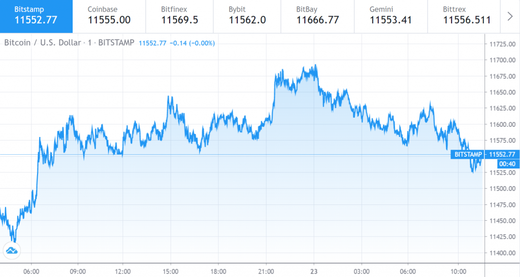 На момент написания статьи Bitcoin торговался по цене 11552,77 долларов США. К 23:21 по Гринвичу криптовалюта достигла дневного максимума в 11690,62 долларов США.