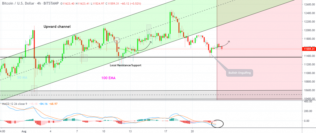 19 августа криптовалюта пробила восходящий параллельный канал, в то время как торговая пара BTCUSD удержалась на уровне сопротивления. Индикатор схождения-расхождения скользящих средних (MACD) указывает на скорый разворот цены на графиках BTC, а бычье поглощение произошло 22 августа.