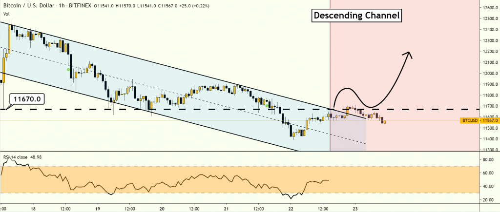 Технический анализ указывает на то, что цена короля криптовалют отскочит от локального уровня поддержки, расположенного около отметки $11400, и вернется в восходящий канал, который она ранее пробила.