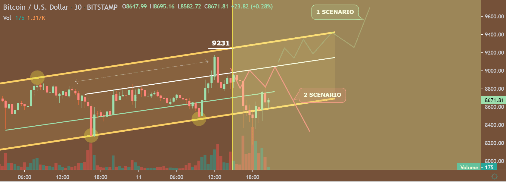 Сценарий 1 предполагает восходящий тренд криптовалюты, который бы следовал за бычьей линией тренда биткоина. Bitcoin 2, напротив, предполагал, что монета пробьёт уровень поддержки $8400.