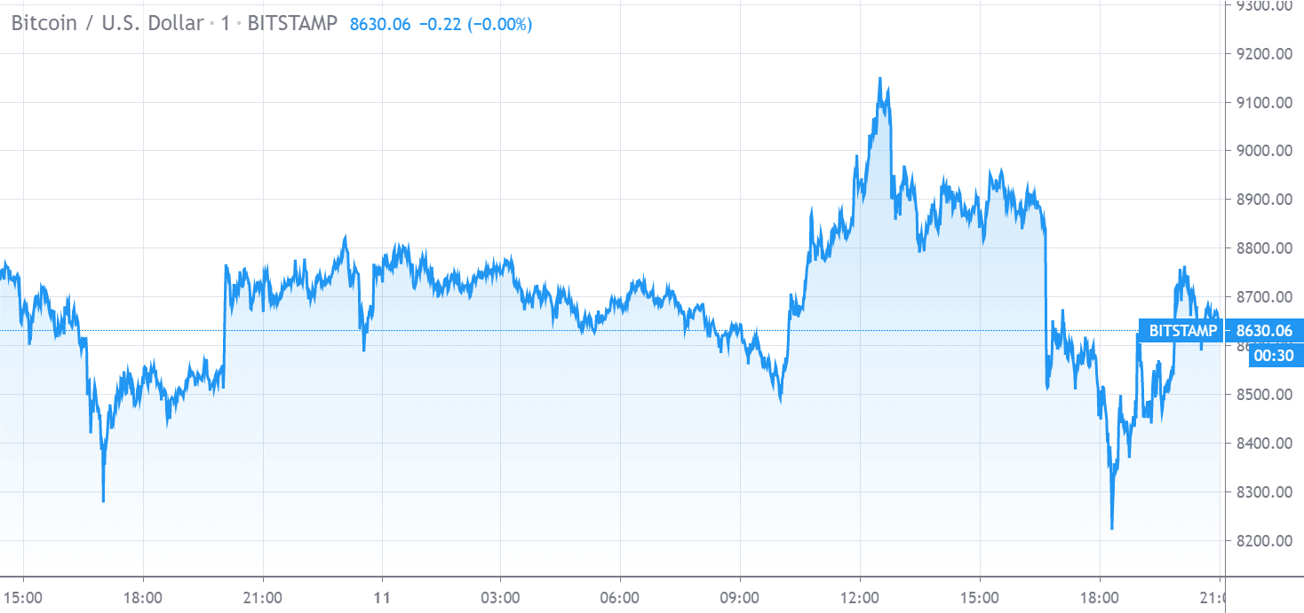 После обвала, произошедшего в начале 10 мая, Bitcoin Криптовалюта продемонстрировала восходящий тренд после 09:00 по Гринвичу, где цена достигла дневного максимума в $9182,97.