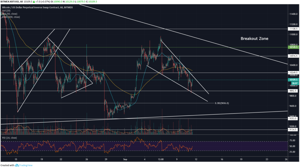 Падающий клин на краткосрочном графике формируется сразу после того, как цена Bitcoin поднялась почти до отметки в одиннадцать тысяч долларов (11 000 долларов).