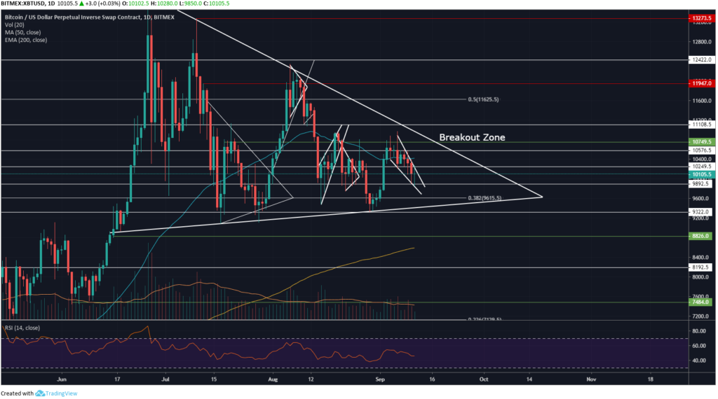 Это произошло сразу после падения до отметки в девять тысяч четыреста долларов (9400 долларов) в начале сентября. Таким образом, Bitcoin (BTC) находится в нисходящем тренде, и считается, что его история повторится.