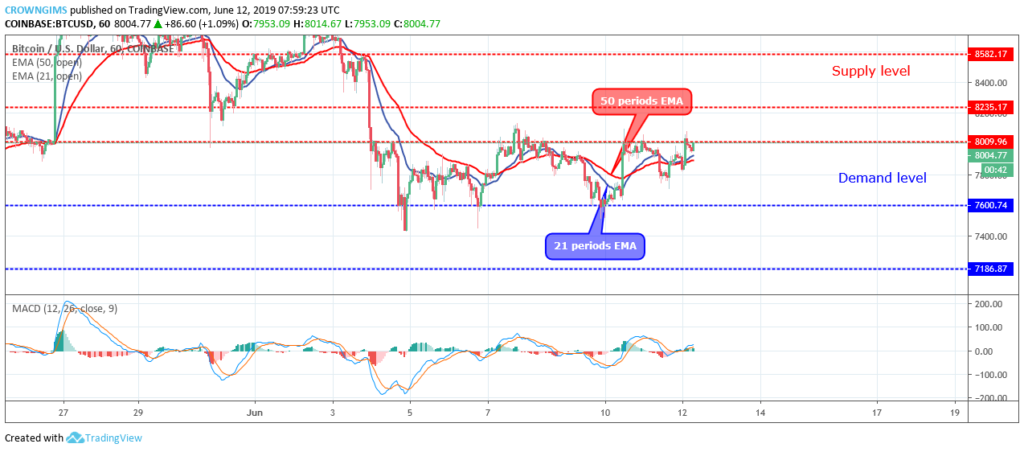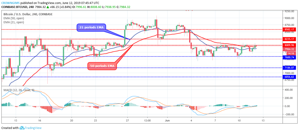В последнее время восходящие рыночные тренды с трудом пробивают сопротивление на уровне 8009 долларов. Пара находится между 21-периодной и 50-периодной экспоненциальными скользящими средними, и обе они плоские и горизонтальные.