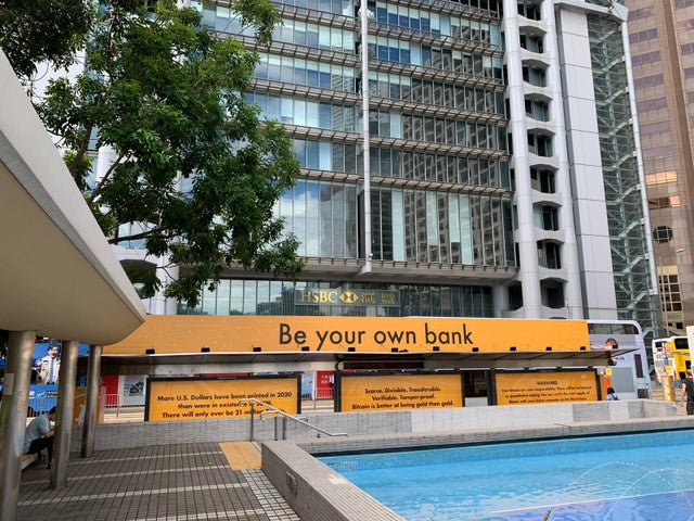 «Реклама,Bitcoin , размещена прямо перед штаб-квартирой HSBC в Гонконге — это вызов или еще один шаг вперед к финансовой инклюзивности?»