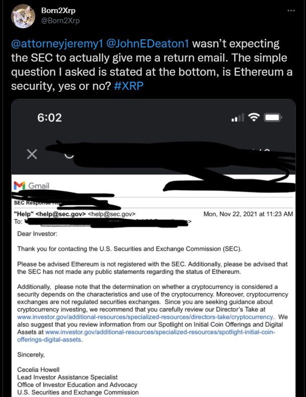 Комиссия по ценным бумагам и биржам (SEC) подверглась резкой критике за продолжающийся судебный процесс против XRP , собственного токена Ripple . Недавно просочившийся в сеть электронный ответ от SEC показывает, что комиссия отрицает какие-либо публичные заявления по поводу Ethereum . Однако всего два года назад Уильям Хинман объявил Ether и Bitcoin неценными бумагами, и это заявление до сих пор опубликовано на сайте SEC.