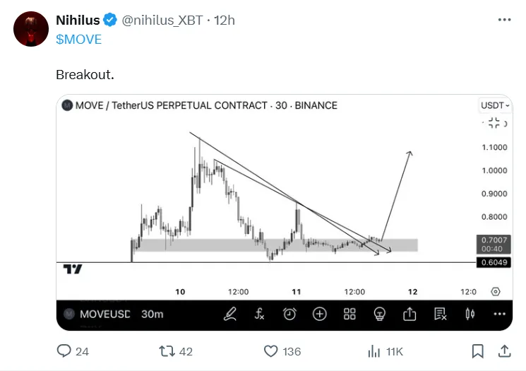 Несмотря на высокую волатильность ведущих криптовалют на рынке в целом, токен $MOVE привлек внимание криптоинвесторов благодаря своим перспективам развития экосистемы. Такие влиятельные лица, как @nihilus_XBT и @CryptoProject6, выразили оптимизм по поводу будущего развития $MOVE.