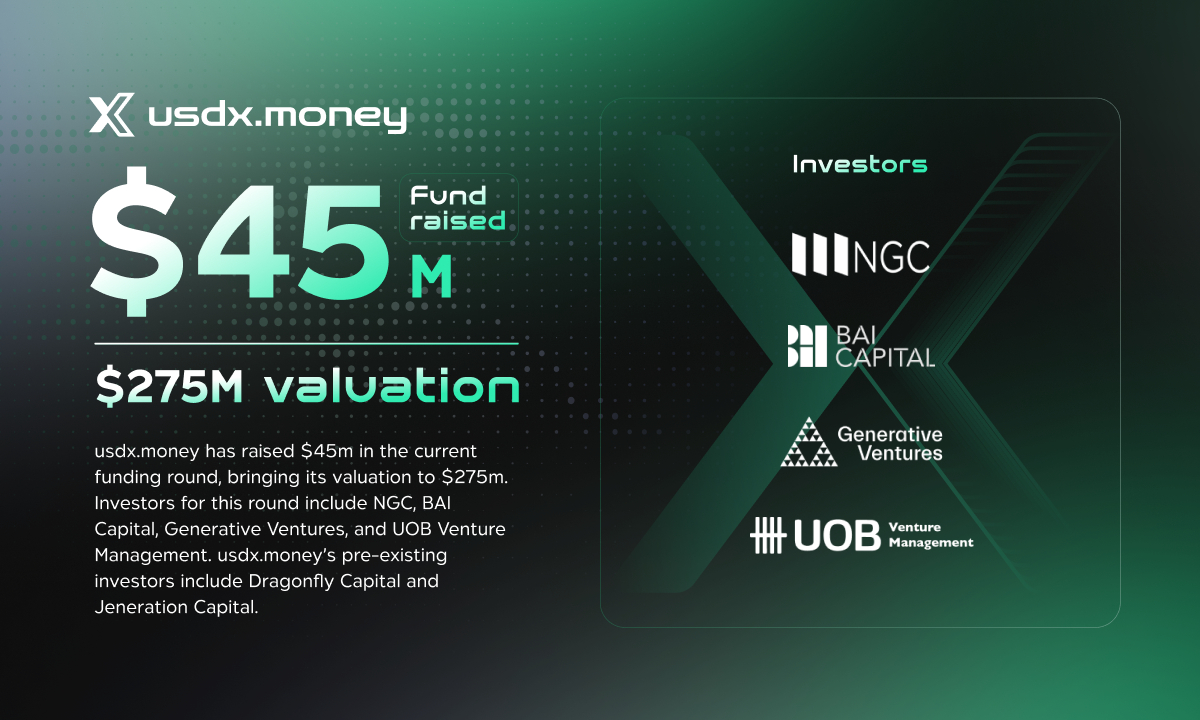 usdx.money , занимающийся развитием инфраструктуры стейблкоинов, объявил о привлечении 45 миллионов долларов в последнем раунде финансирования. В результате раунда оценка проекта составила 275 миллионов долларов. В число инвесторов этого раунда входят NGC, BAI Capital, Generative Ventures и UOB Venture Management, при этом часть инвестиций была осуществлена в форме варрантов. Ранее проект уже инвестировал в Dragonfly Capital и Jeneration Capital.