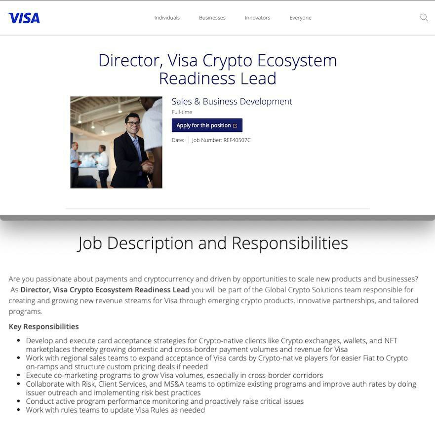 недавнему объявлению о вакансиях , компания ищет ещё одного специалиста по криптовалютам на должность «Директора по готовности экосистемы криптовалют Visa». Visa отметила, что кандидат должен обладать аналитическими способностями, свободно владеть криптовалютой и уметь отлично решать проблемы.