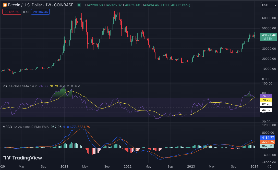 цены Bitcoin показывает, что в начале недели BTC торговался в медвежьем тренде, с некоторым бычьим импульсом. Однако это было недолговечно, так как медведи вернулись на рынок позже на этой неделе. Пара BTC/USD в настоящее время торгуется около $43 557 , с падением за 24 часа на -0,82%. Общее рыночное настроение в отношении BTC по-прежнему медвежье, при этом ключевой уровень сопротивления находится на отметке $45 000, а уровень поддержки — на отметке $40 000.
