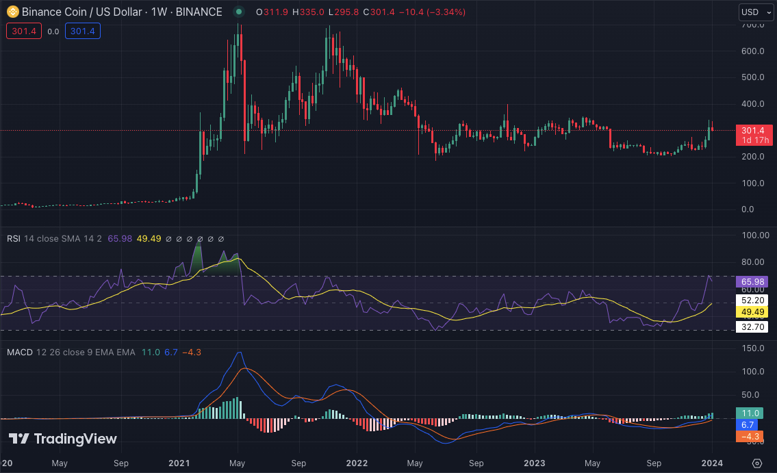Еженедельный анализ цены Binance Coin ( BNB ) показывает, что в последние несколько дней рынок контролировали медведи. BNB пробил и закрылся ниже симметричного треугольного паттерна, что свидетельствует о победе медведей над быками. На момент написания статьи BNB торгуется на уровне $318, показав минимальный рост на 0,58% за последние 24 часа; однако за последние семь дней BNB потерял 5,26%. Рыночные настроения в отношении BNB по-прежнему медвежьи, при этом ключевые уровни сопротивления находятся на отметке $330, а поддержки — на уровне $290.