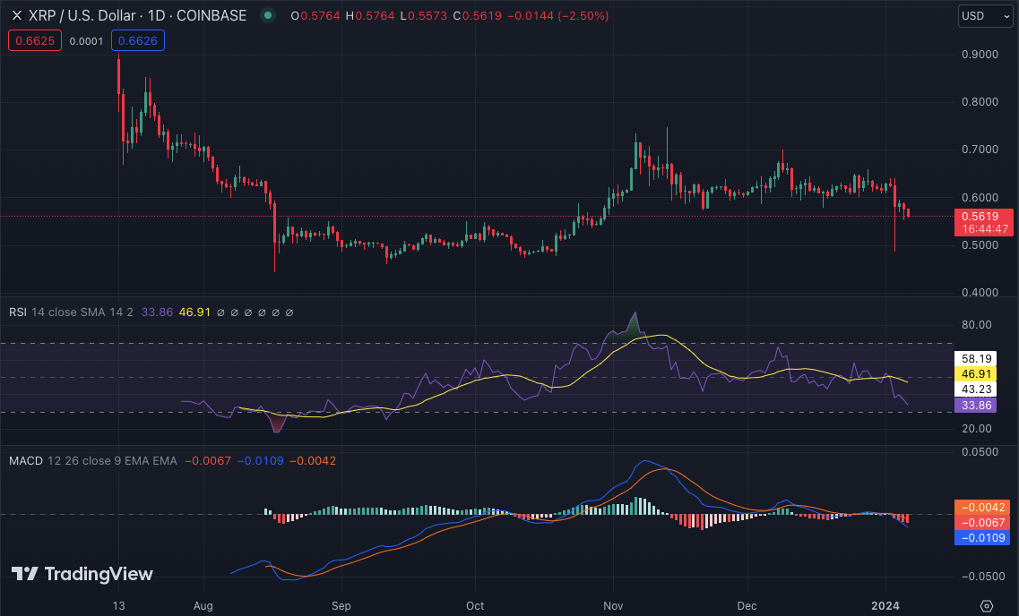 цены XRP показывает, что медведи контролировали рынок большую часть недели, толкая цену к рекордно низким уровням. За последние семь дней XRP потерял 10% своей стоимости и в настоящее время торгуется на уровне 0,5559 , с падением на 2% за 24 часа. После иска SEC против Ripple рыночные настроения в отношении XRP стали медвежьими, при этом ключевой уровень сопротивления находится на отметке 0,5800 доллара, а уровень поддержки — на отметке 0,500 доллара. Цена XRP в настоящее время находится ниже 200-дневной скользящей средней, что указывает на tron медвежий тренд в ближайшем будущем.