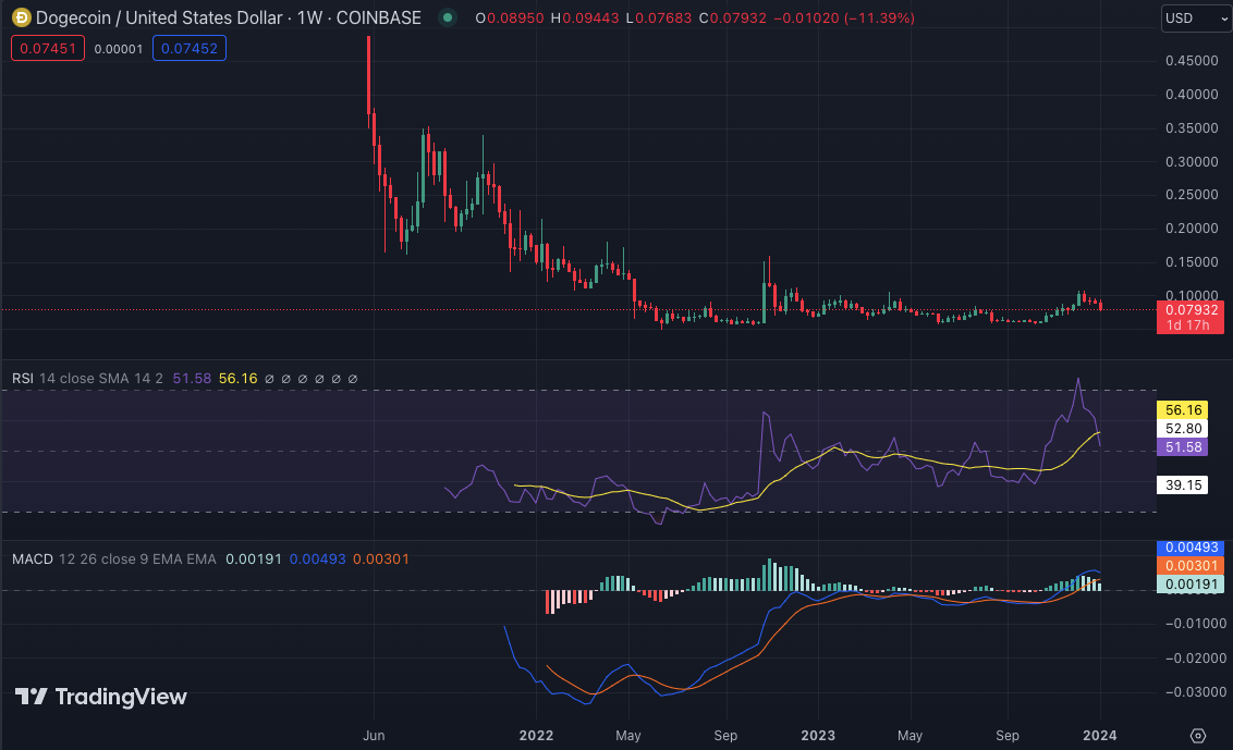 Еженедельный анализ цены криптовалюты Dogecoin (DOGE) показывает, что на рынке доминируют медведи, и DOGE торгуется ниже своего важнейшего уровня поддержки в $0,0800. В настоящее время криптовалюта, ставшая популярной благодаря мемам, торгуется на уровне $0,07926, показав спад за 24 часа на -4% и за семь дней на -12%. Медведи и быки борются за контроль, и рыночные настроения остаются медвежьими, при этом ключевой уровень сопротивления находится на отметке $ 0,800 , а уровень поддержки — на $0,0700.
