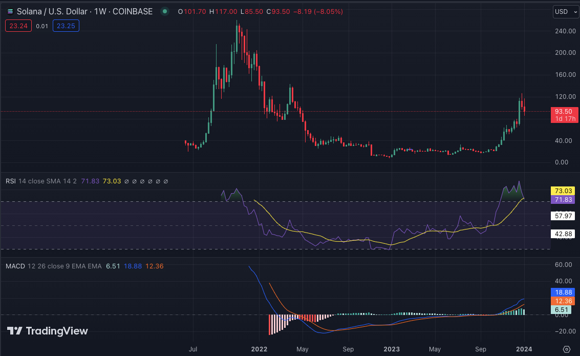 Индикатор MACD показывает, что на рынке доминируют медведи, сигнальная линия находится выше линии MACD. Индекс относительной силы (RSI) в настоящее время колеблется около 71, что указывает на бычий настрой в отношении SOL. Однако, если быки поднимут цену выше 105 долларов, SOL может восстановиться до 110 долларов; если же медведи продолжат доминировать, возможно падение до 95 долларов. 50-недельная скользящая средняя также находится ниже 200-недельной скользящей средней, что указывает на то, что медведи теперь контролируют рынок.