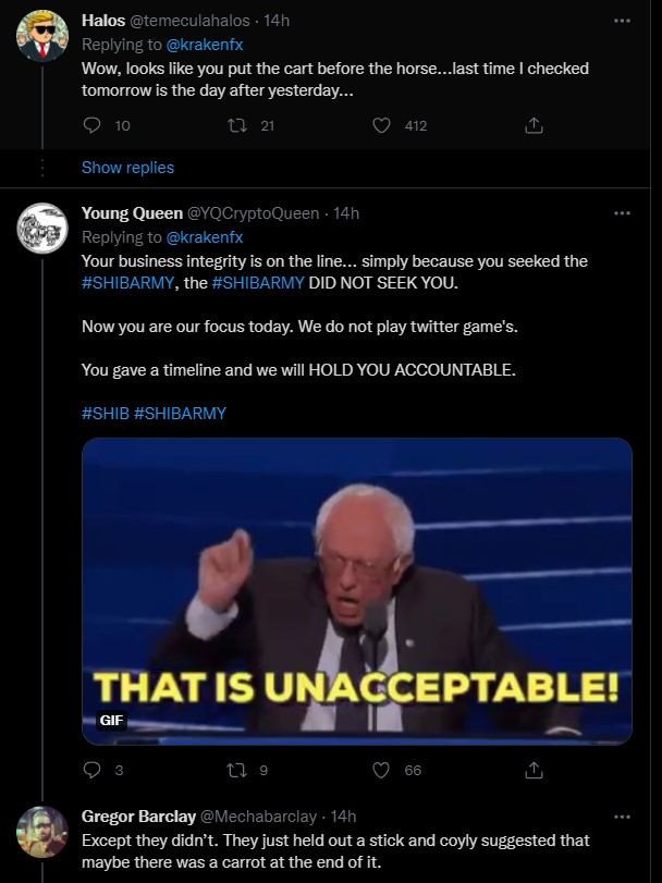 Неудивительно, что твит получил более 7 тысяч лайков менее чем за 24 часа и более 18 тысяч ретвитов. Однако с тех пор Kraken, похоже, отвернулся от сообщества Shib-ину, заявив, что процесс проверки объявлений еще нуждается в доработке.