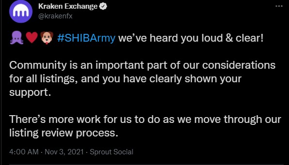 - Команда поддержки Kraken сообщила, что активно работает над скорейшим листингом SHIB .