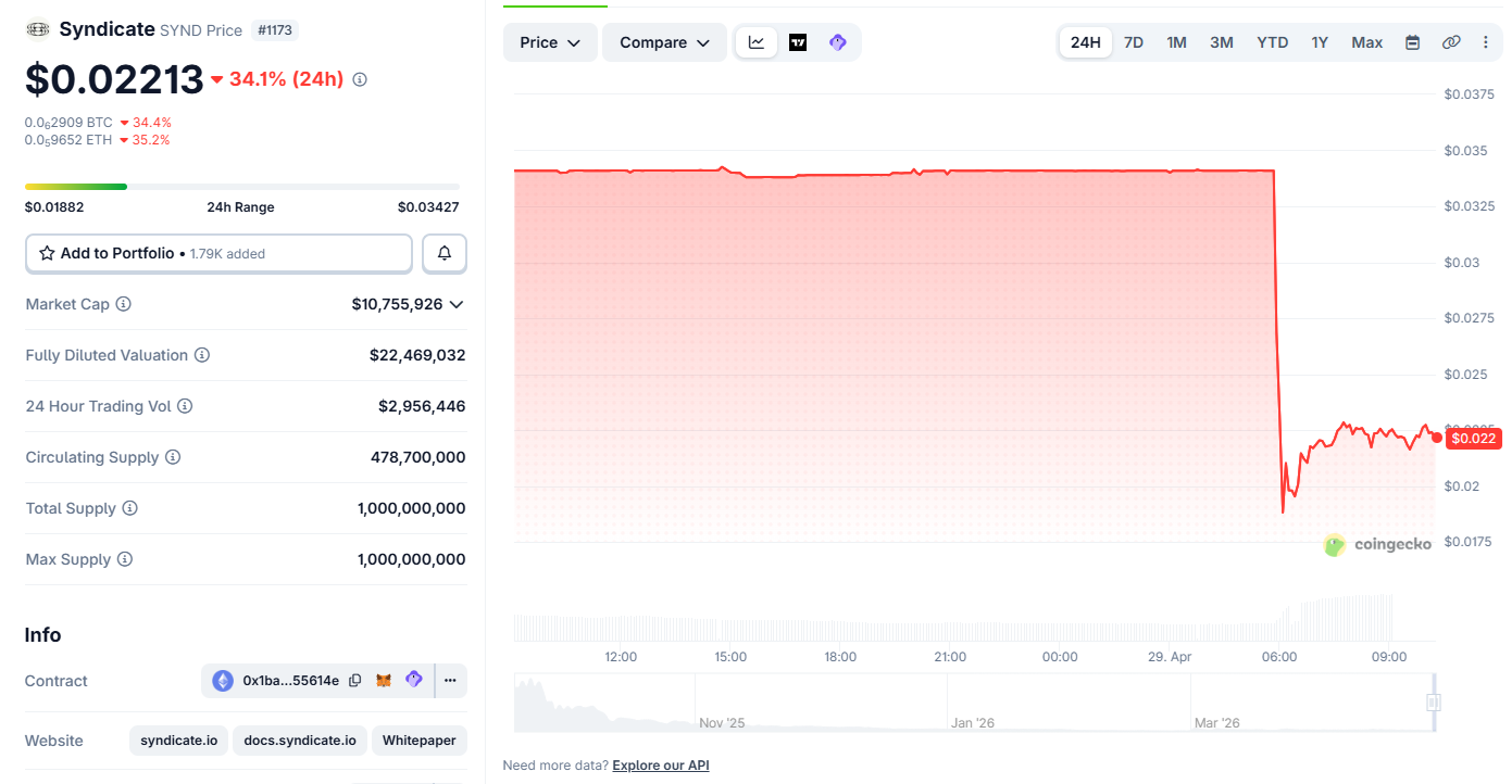 As a result, SYND tokens fell to a new low of $0.019 after rapid selling. The token saw a spike in daily volumes to $2.9M after weeks of softer activity. Hours after the attack, the team did not give an estimate of the types of assets lost.