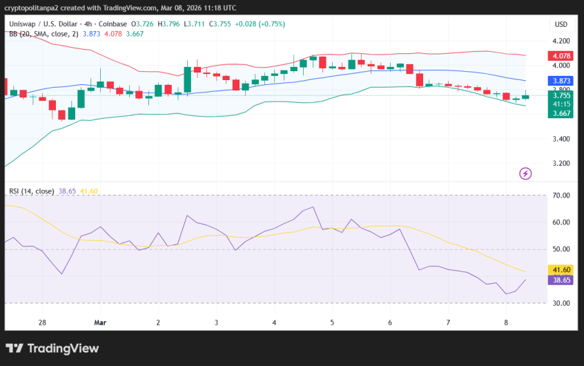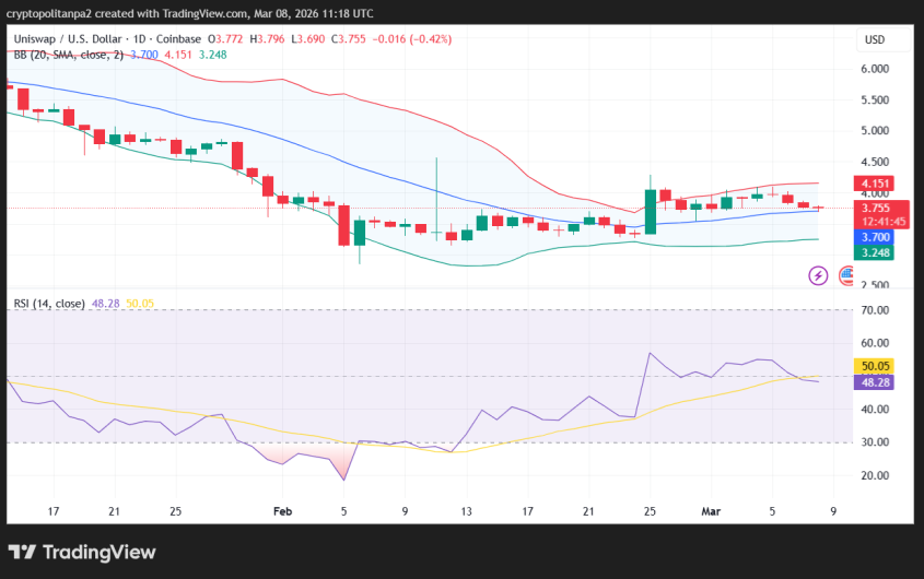 On March 8, 2026, Uniswap (UNI) price analysis reveals a bearish trend. Over the past 24 hours, the altcoin’s price declined toward $3.75, losing a significant 2.05% of its value. The altcoin is currently facing long-liquidations around local highs, preventing any recovery rallies. However, it seems like selling pressure remains strong at the current price level and support for UNI is established at the $3.60 level.