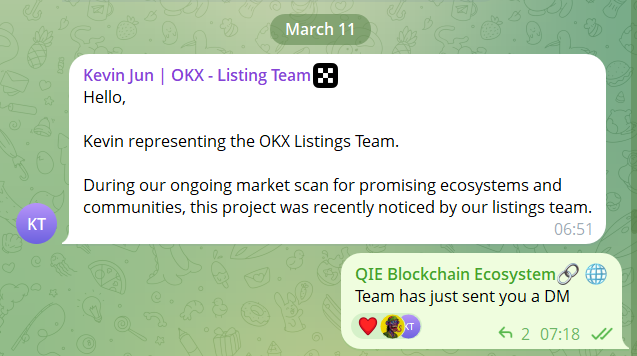 The individuals contacted our team claiming they could facilitate a listing for QIE Blockchain. They introduced themselves on Telegram as: