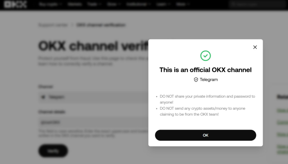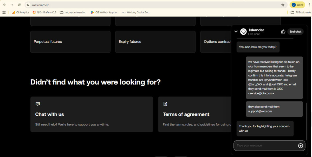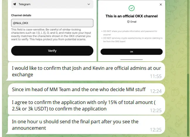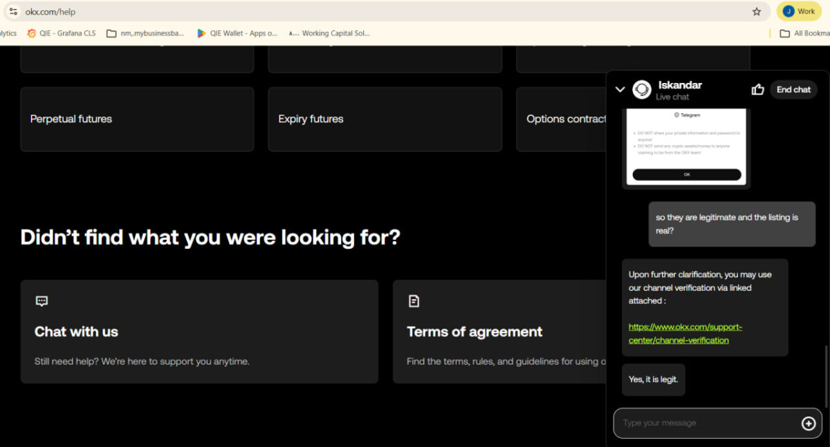 To be absolutely certain, we even contacted OKX live support, which confirmed that these accounts appeared legitimate and that we could trust the communication.