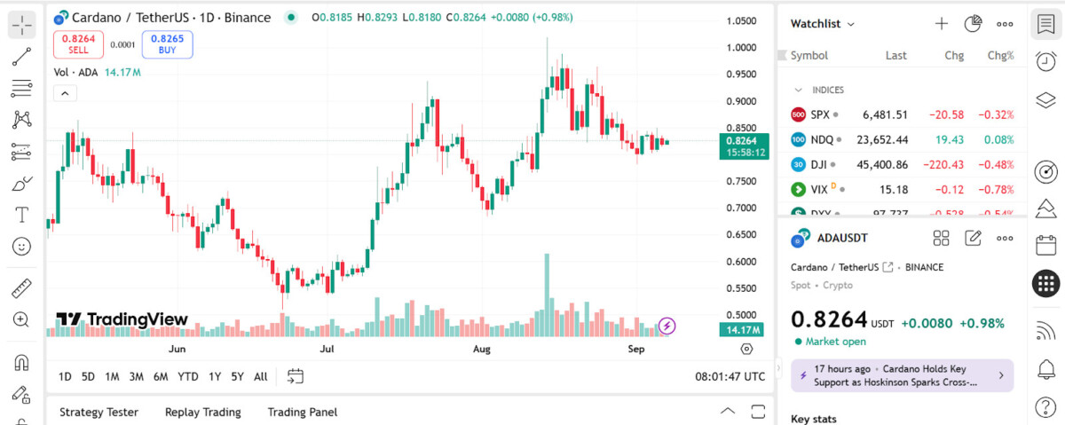 根据近期报告, Cardano 价格预测显示,ADA 可能难以守住关键支撑位。目前 ADA 的交易价格接近 0.83 美元,其图表形态呈现看跌趋势,包括下降通道和成交量减弱,如果这些支撑位失效,ADA 可能跌破 0.50 美元。一些技术模型甚至预测,在支撑位发挥作用之前,ADA 的价格可能会跌至 0.60 美元附近。.