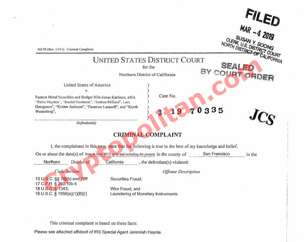 美国司法部新闻稿透露,针对卡尔森及其公司东方金属证券(EMS)于 2019 年 3 月 4 日提起的诉讼已被解封,美国当局在逮捕卡尔森后,正寻求将其绳之以法。
