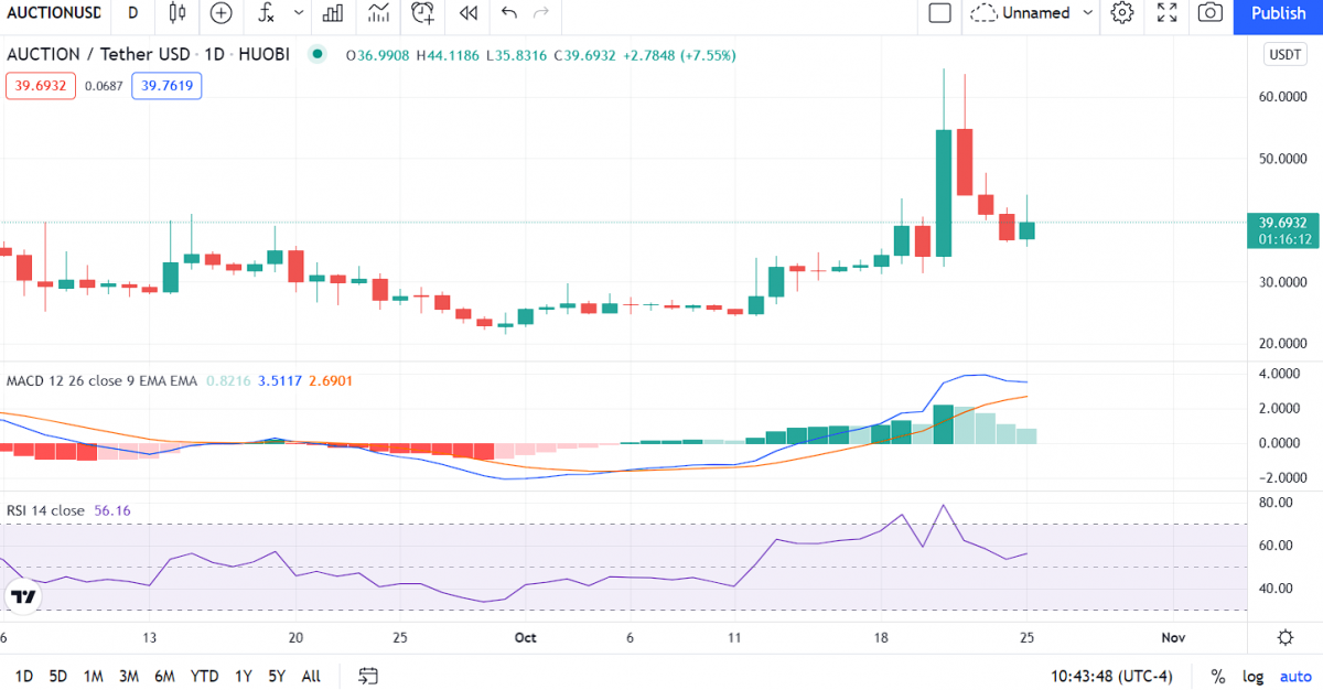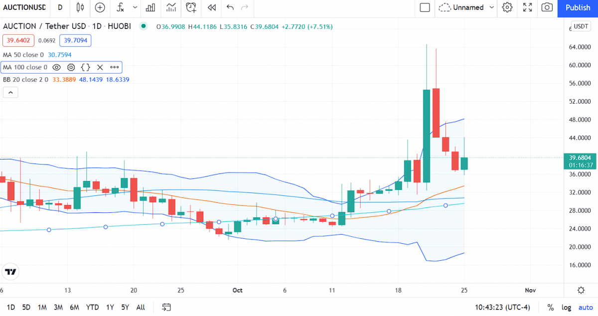 Trading View 对日线图上的 AUCTION 价格分析显示,该价格走势突破了布林带上轨,随后由于连续 3 根红色蜡烛线而下跌。.