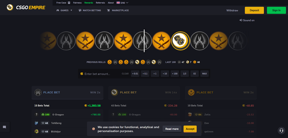 CSGOEmpire 的核心玩法非常精简——轮盘赌、抛硬币和比赛投注——因此学习曲线很短。在我们的测试中,游戏性能稳定可靠。游戏提供了公平性信息,但部分解释读起来像文档,对于新手来说可能比较难懂。.