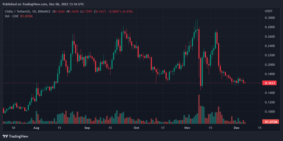 由于市场持续低迷,Chiliz 的价值也随之下跌。最新数据显示,其股价在过去一天下跌了 3.17%。过去七天的数据显示,其股价下跌了 1.33%。目前,CHZ 的价格约为 0.1614 美元。.