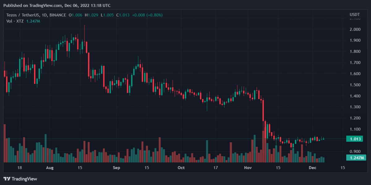 由于持续下跌趋势,Tezos 的价格波动较大。最新数据显示,过去一天其价格下跌了 1.15%。过去七天的数据显示,其价格上涨了 2.90%。目前,XTZ 的价格在 1.01 美元左右。.