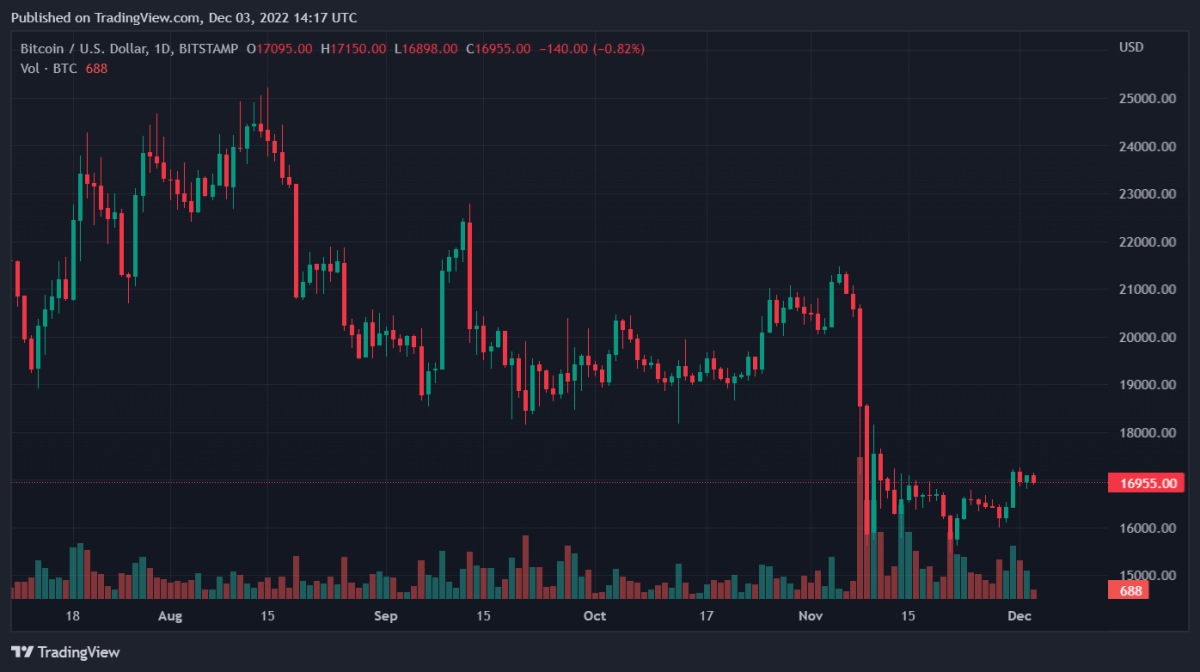 比特币价格停滞在 16.9 万美元。
