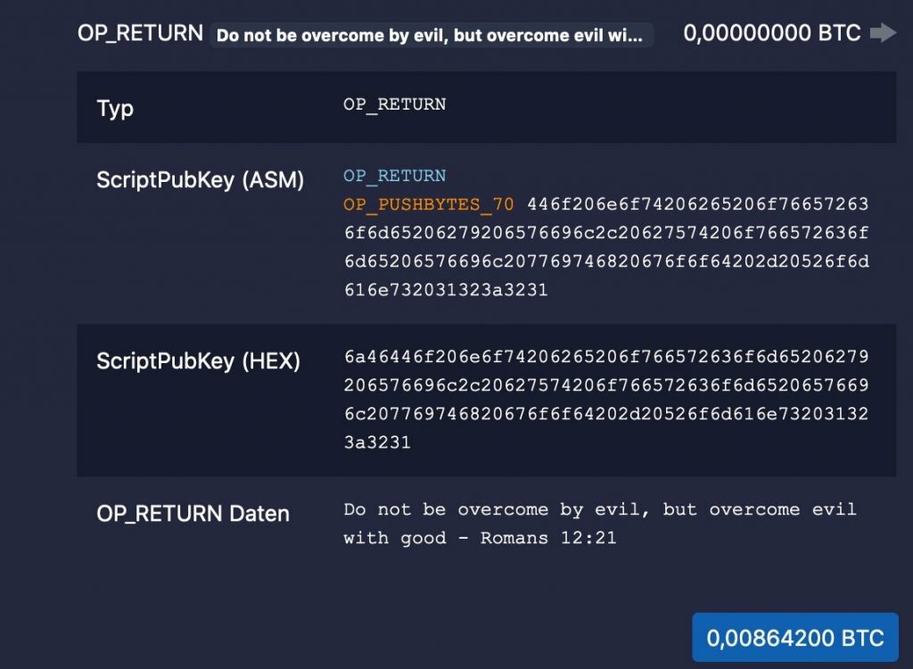 Bitcoin 区块编号 666,666 的最后一笔交易的“OP_RETURN Daten”引用了圣经罗马书 12:21 的一段话:“不要被恶所胜,反要以善胜恶。”与此同时,这笔包含该信息的最后一笔交易涉及 0.01000000 BTC,价值约 354.66 美元,与 Coinmarketcap 上 Bitcoin 35,466 美元的价格相符。.