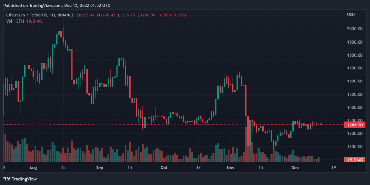 以太坊(ETH)目前的价格约为 1268.78 美元。该代币的市值估计为 155,265,173,028 美元。其 24 小时交易量约为 4,885,454,679 美元。.
