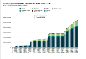 库存流量模型的B计划测试预测,Bitcoin价格在2021年将上涨至当前价值的十倍。具有讽刺意味的是,即使在近期全球疫情肆虐的情况下,根据灰度发布的2020年第一季度研究报告,Bitcoin似乎仍然主导着加密货币投资基金,而以太坊所占份额相对较小。