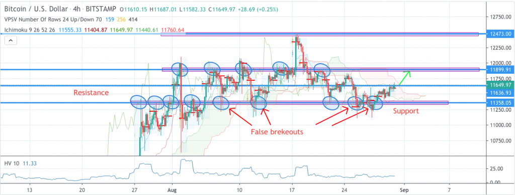 过去五天,Bitcoin价格走势相当不稳定,短期内难以预测,最低点出现在8月25日和27日,接近11125美元。这充分说明了这种加密货币的不稳定性。另一方面,在2020年8月28日逐步回升后,价格稳定在11300美元上方。截至发稿时,Bitcoin交易价格为1164.33美元,鉴于上图所示的反向头肩形态仍在持续,价格可能出现上涨。