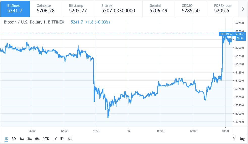 近日,Bitcoin经历了数次短暂下跌。早盘的暴跌使其跌至 5000 美元附近。随后,比特币在 4900 美元附近获得支撑,并反弹超过 100 美元,今日回落至 5241.7 美元。