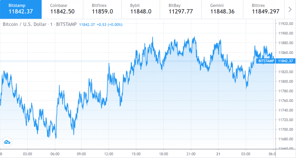 该加密货币一度跌至当日低点 11680.78 美元。晚间,比特币价格反弹至当日高点 11894.24 美元。截至发稿时, Bitcoin 交易价格为 11842.37 美元。.