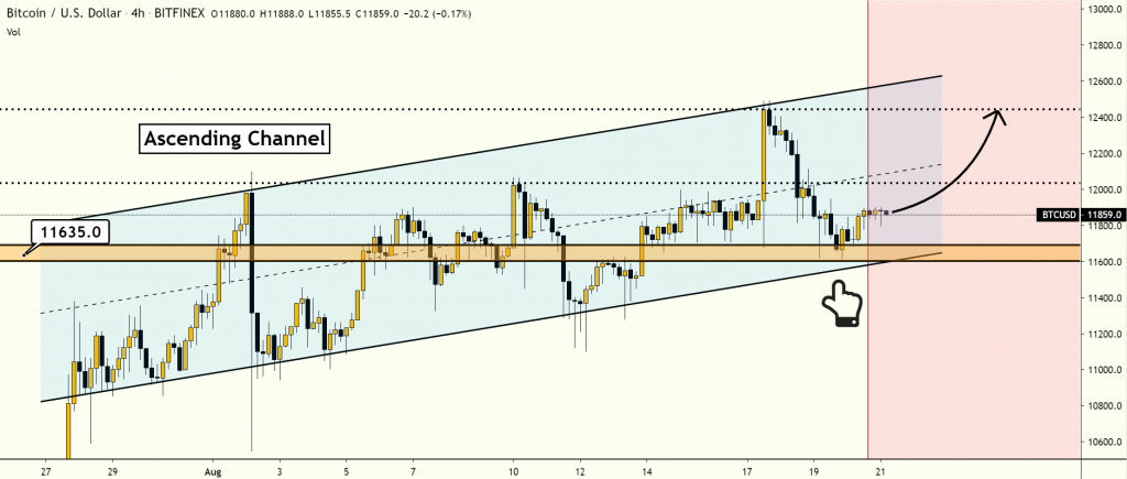 比特币价格在 11635 美元附近形成了一个重要的阻力位,该阻力位位于上升平行通道的中部。8 月 13 日,比特币价格突破了该阻力位,该阻力位目前已成为支撑位。8 月 17 日,比特币价格测试了 12400 美元关口,之后反弹至 11635 美元支撑位附近。比特币价格守住了该支撑位,预计将再次测试 12400 美元附近的阻力位。.