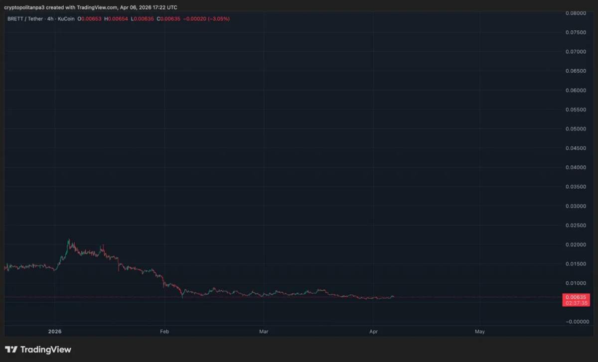 - 从 3 月下旬到 4 月 6 日,BRETT 曾短暂反弹至 0.0085-0.0090 美元,但随后回落,最终收于 0.0065 美元附近,整体结构仍然处于深度看跌状态——卖方在每一次反弹尝试中都予以防守,并不断形成更低的高点。.