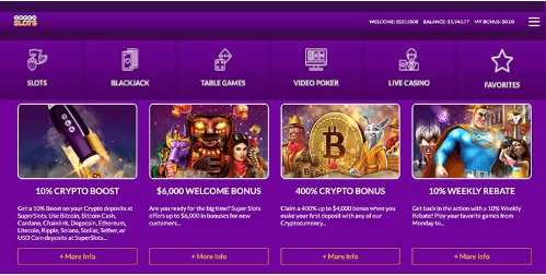 - 超级老虎机:我们推荐您加入这家在线赌场,享受高达 400% 的首存匹配奖金。使用优惠码 CRYPTO400,即可让您的Bitcoin钱包增加 4,000 美元。