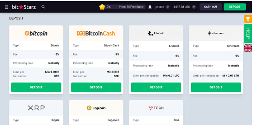 对于美国玩家而言,Bitstarz 是一个仅限加密货币的平台。国际玩家可以使用法定货币,而美国玩家则可以选择 Bitcoin、 Litecoin、 Bitcoin Cash、 Ethereum、 Dogecoin和泰达币。总共六种选择——这应该足以满足大多数玩家的需求。